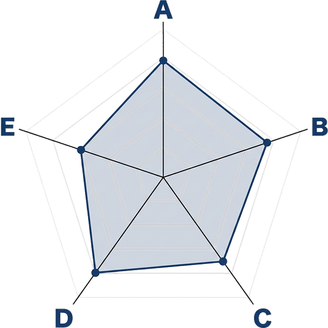 各部門は5軸で評価を行い、「5軸評価レーダーチャート」にて評価とスコアリングし、
